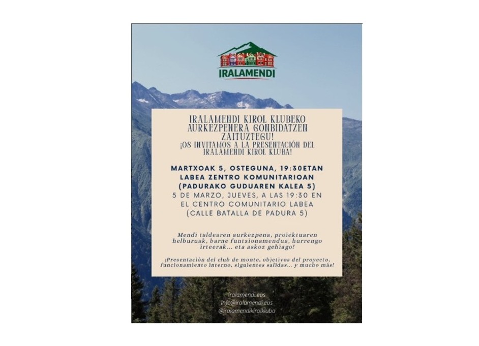 El próximo jueves 5 de marzo a las 19:30 en el Centro Comunitario Labea se va a celebrar la presentación de Iralamendi Kirol Kluba.